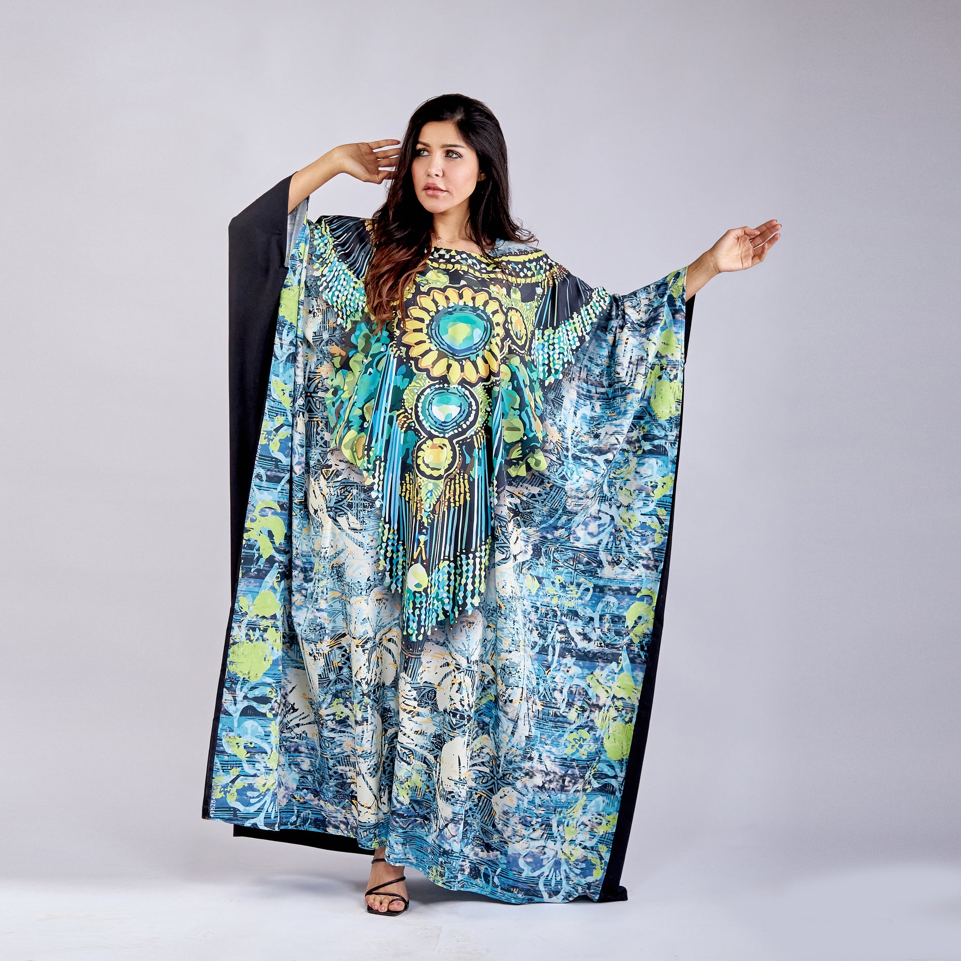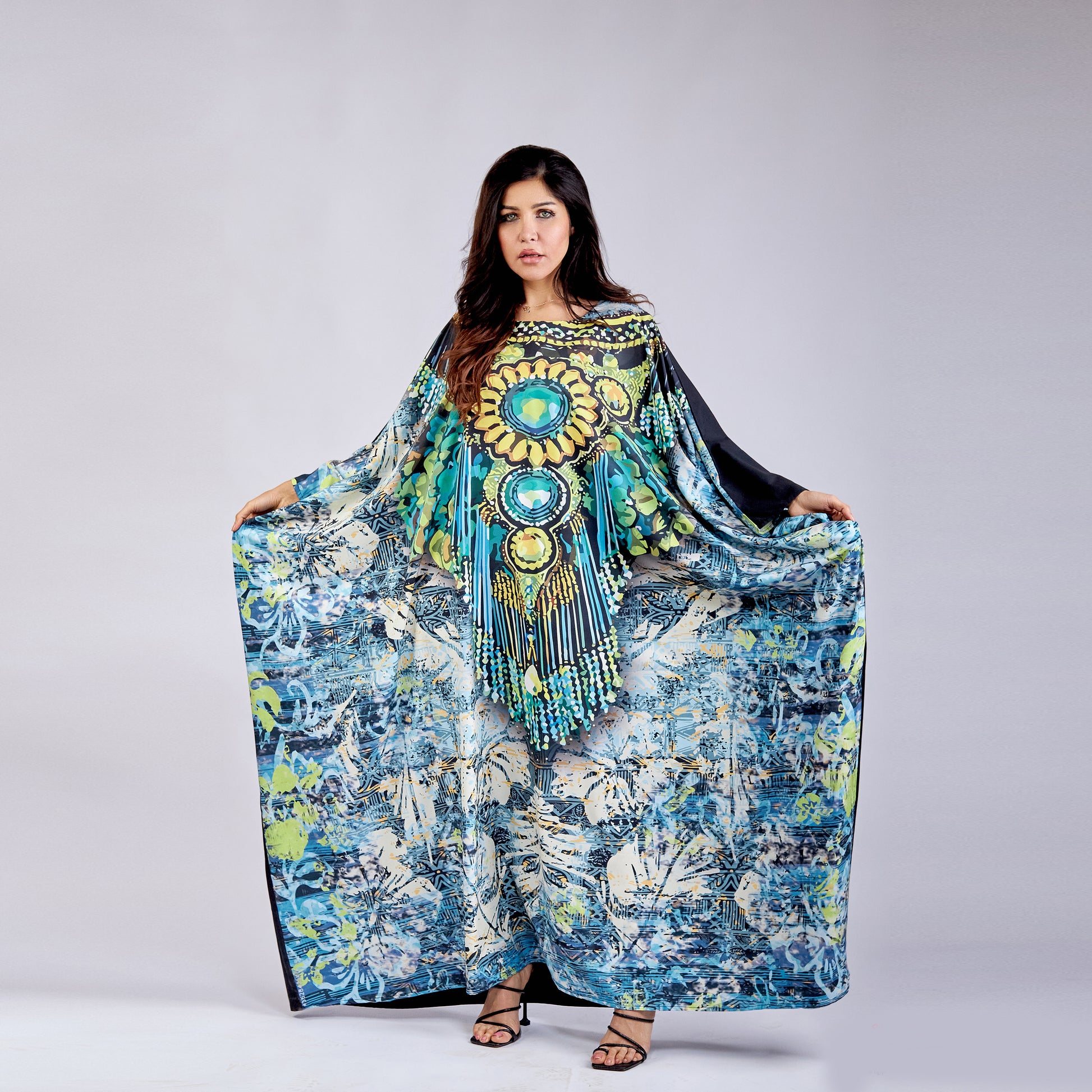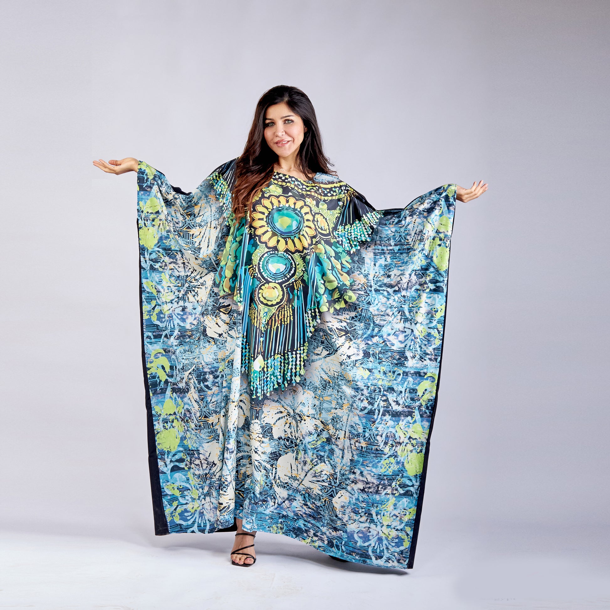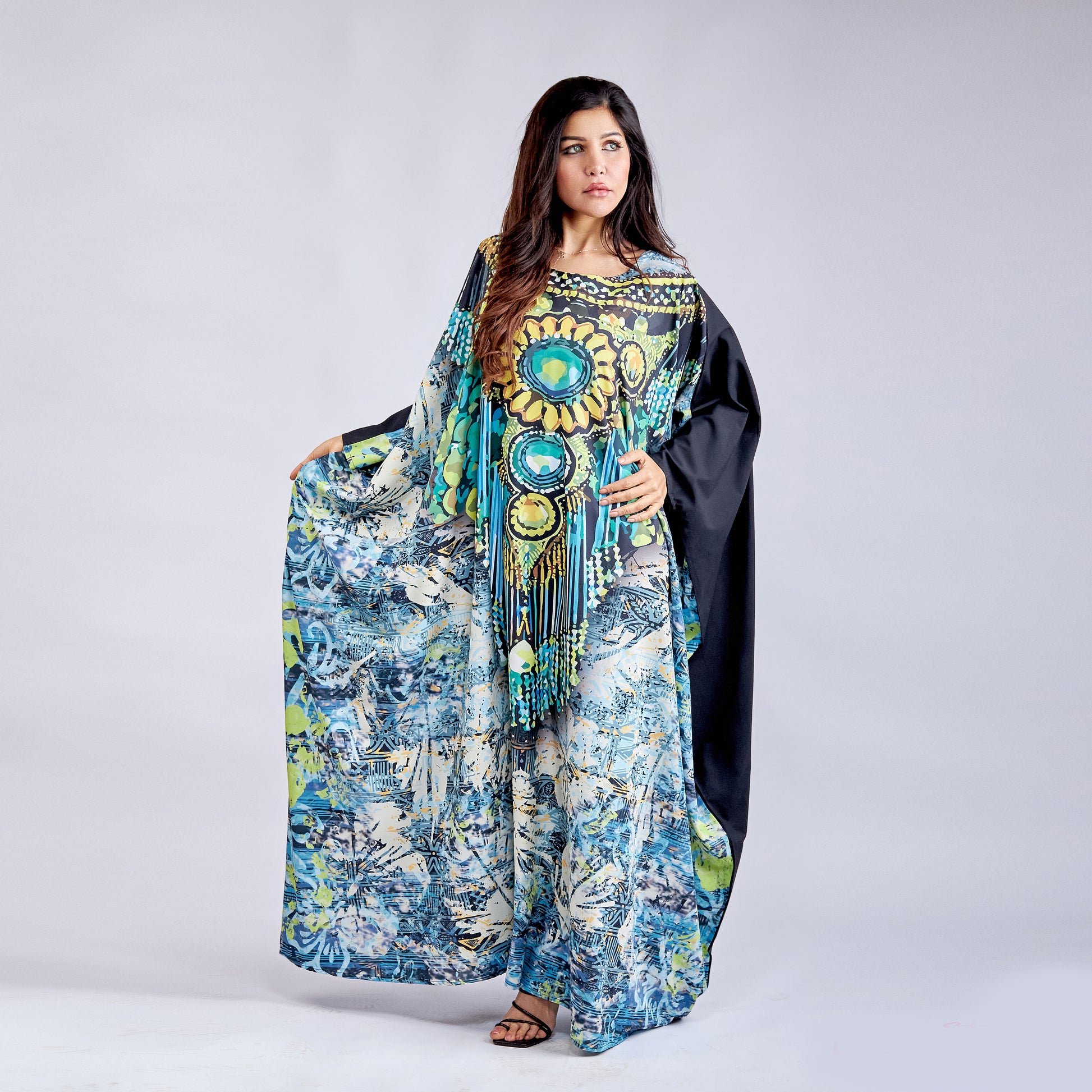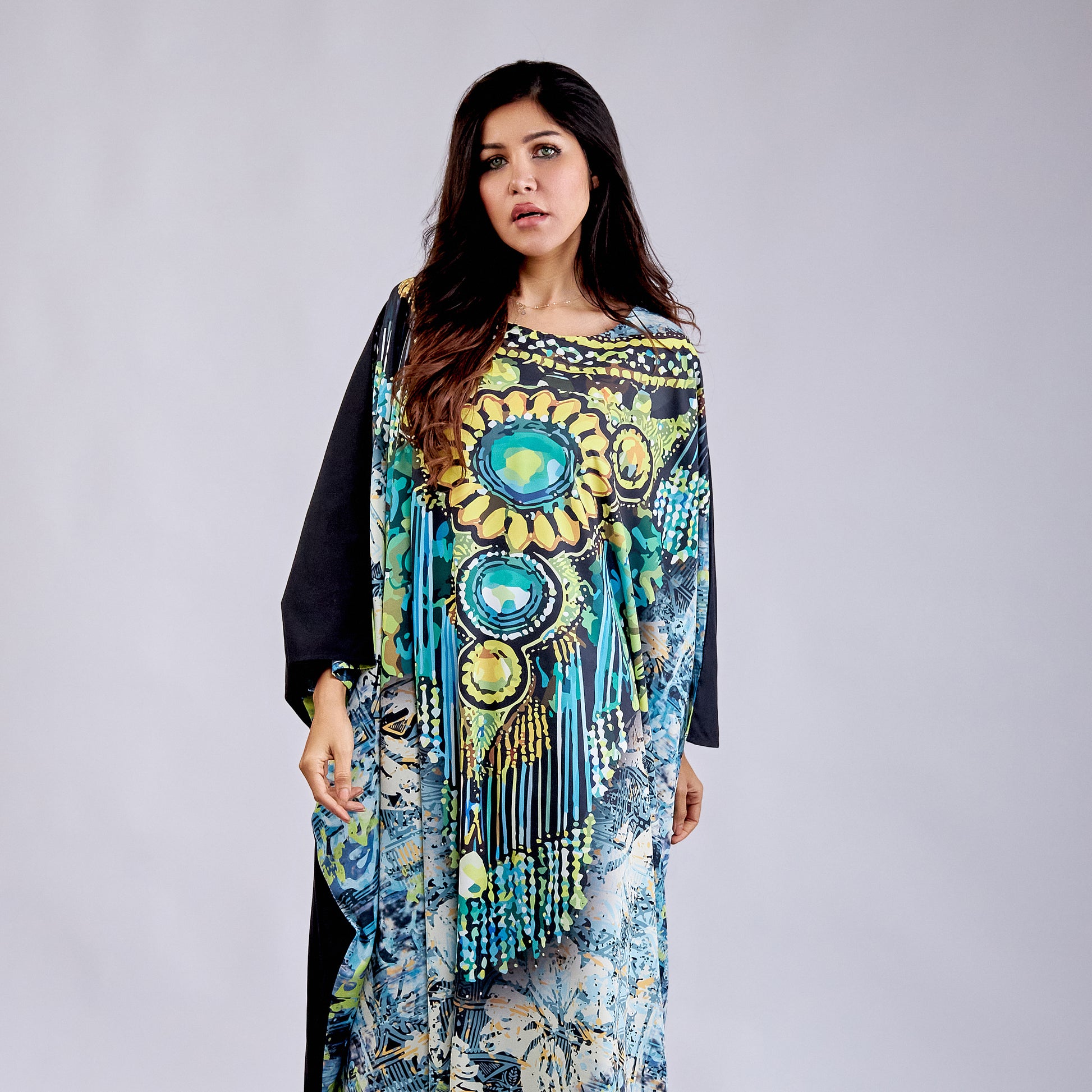 Emerald Queen Kaftan Crafted from premium microfiber fabric, this free-size kaftan delivers exceptional comfort and effortless elegance. The lightweight, breathable material drapes beautifully while resisting wrinkles and fading, making it ideal for everyday wear or special occasions. Its universal fit accommodates various body types, ensuring a flattering silhouette for everyone. The microfiber construction provides durability and easy care—simply machine wash and wear. Perfect for those seeking sophisticated style without compromise, this kaftan combines practical functionality with timeless appeal.